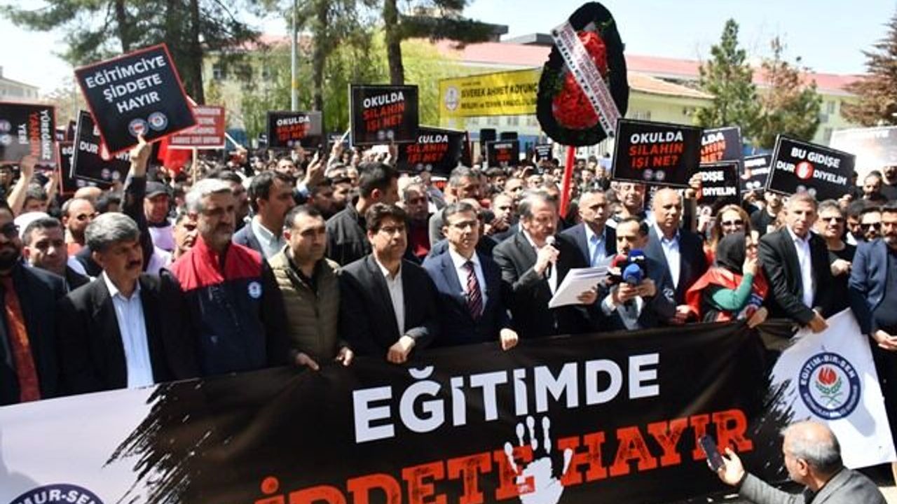 Silahlı saldırı sonrası Başkan Ali Murat Bucak, Eğitim-Bir-Sen Genel Başkanı Ali Yalçın ve sendika üyeleri, Kanlıkuyu Meydanı'nda toplandı.